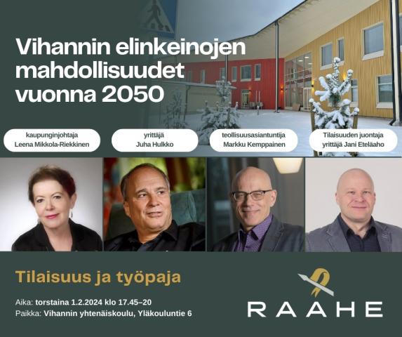 Raahen kaupungin kaavoitus järjestää Vihannissa lähialueiden yrittäjille ja muille sidosryhmille suunnatun tilaisuuden, jossa luodaan katsaus nykytilaan ja kartoitetaan tulevaisuuden teollisuuden edellytyksiä sekä yritystoiminnan tarjoamia mahdollisuuksia Vihannissa.