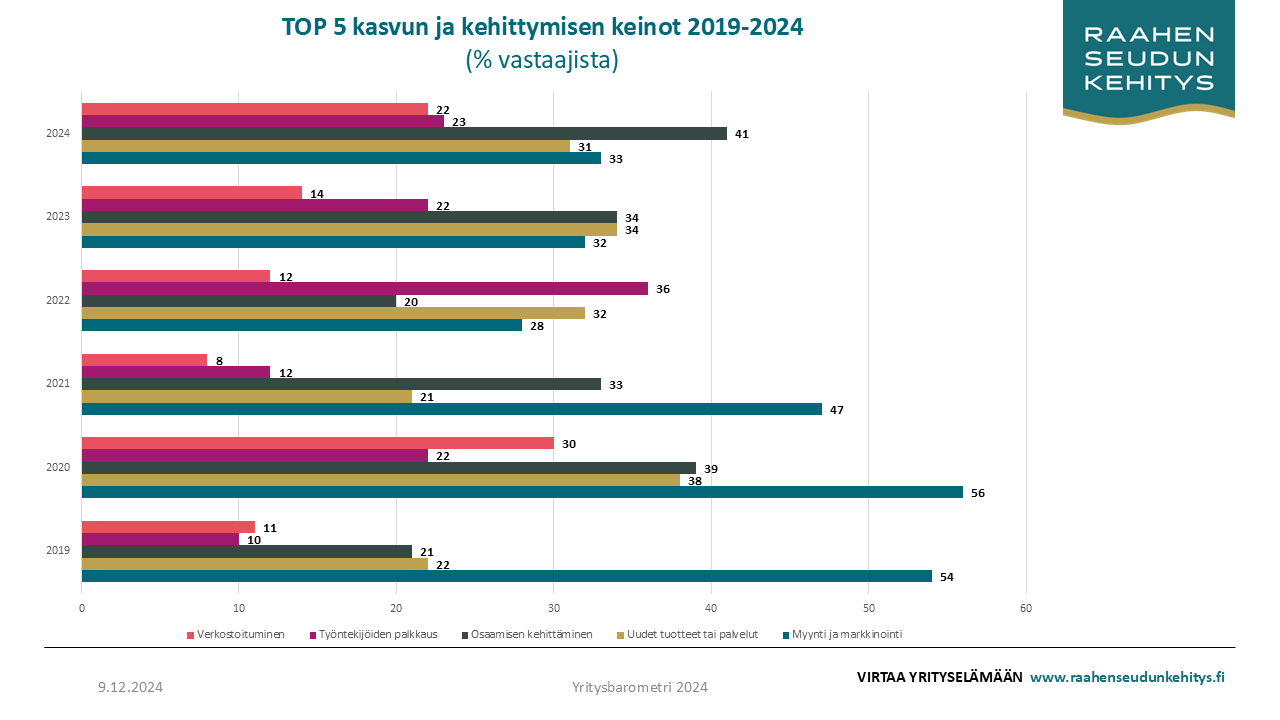 Kasvun ja kehittymisen kolme tärkeintä keinoa ovat edellisvuoden tapaan osaamisen kehittäminen (41 %), markkinoinnin tehostaminen tai uudelleen suuntaaminen (32 %) sekä uudet tuotteet ja palvelut (31 %). Erityisesti osaamisen kehittämisen merkitys on noussut edellisestä vuodesta. Myös verkostoituminen nähdään huomattavasti entistä tärkeämpänä (22 %) ja se on noussut lähes tasoihin yritysten kasvukeinona työntekijöiden palkkauksen (23 %) rinnalle.